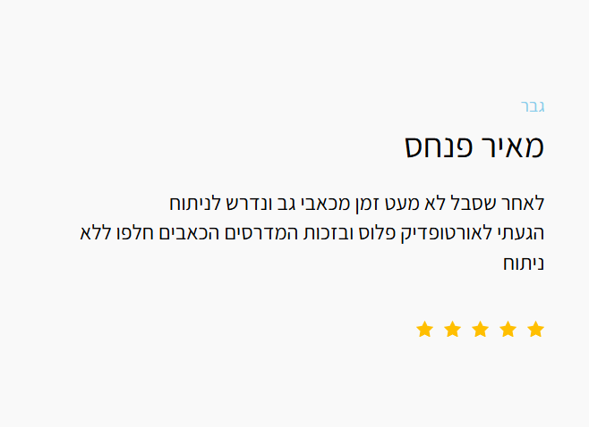 ניסיון מעל 43 שנים. מעל עשרות אלפי לקוחות מרוצים מכל העולם שחזרו ללכת והכי חשוב איכות חיים בלי כאבים